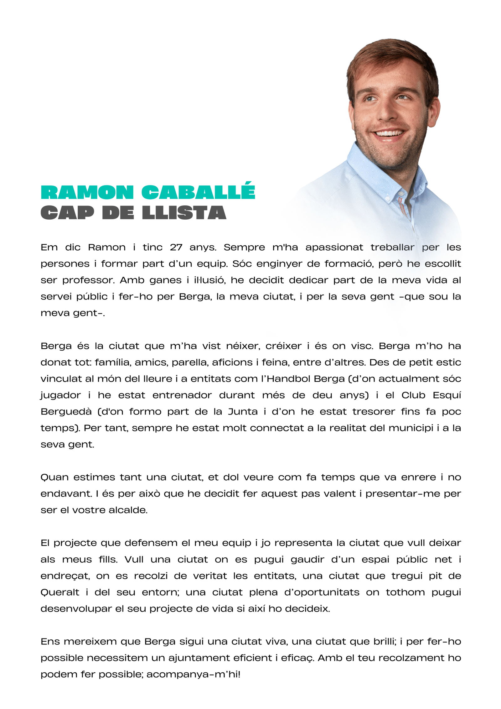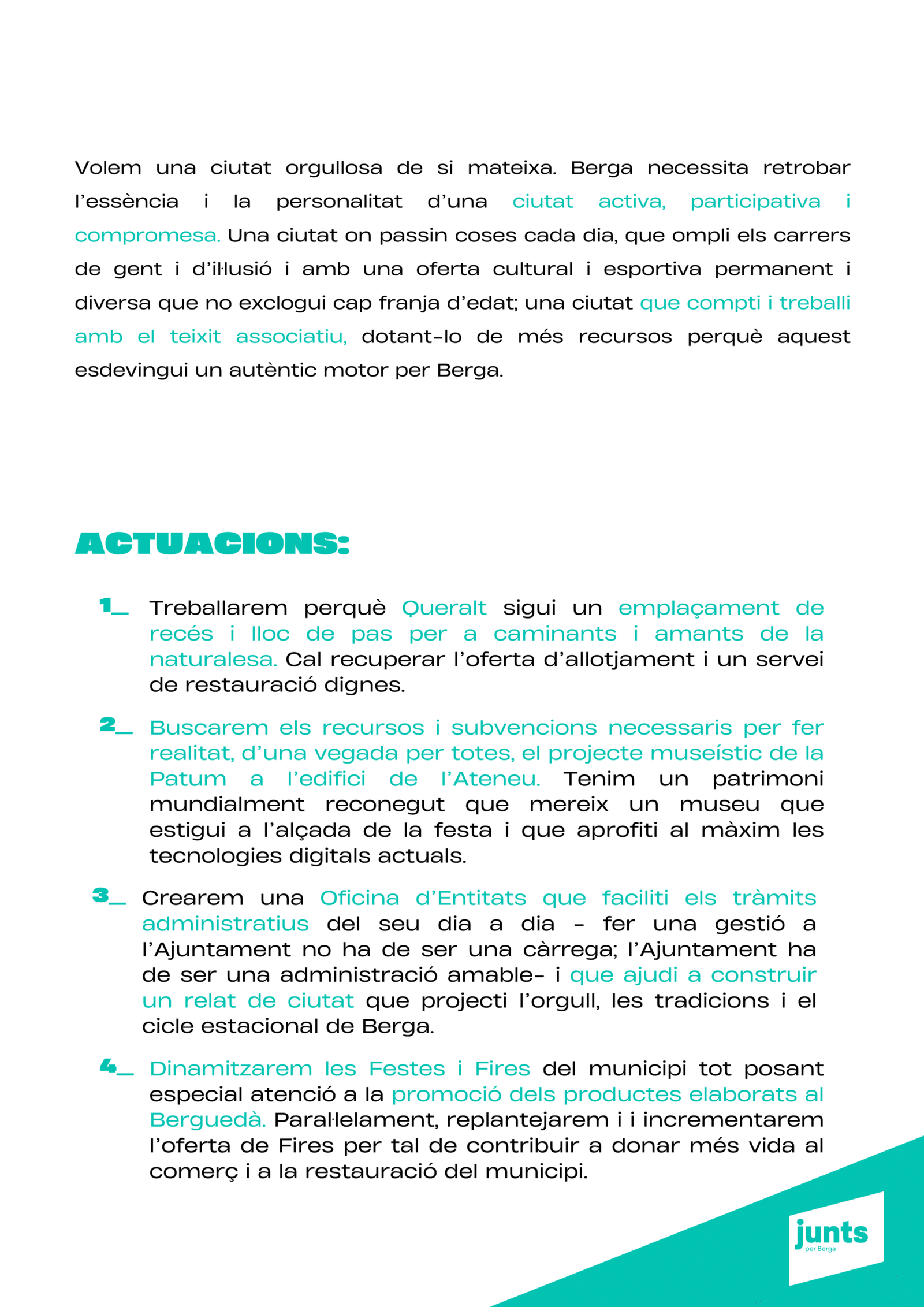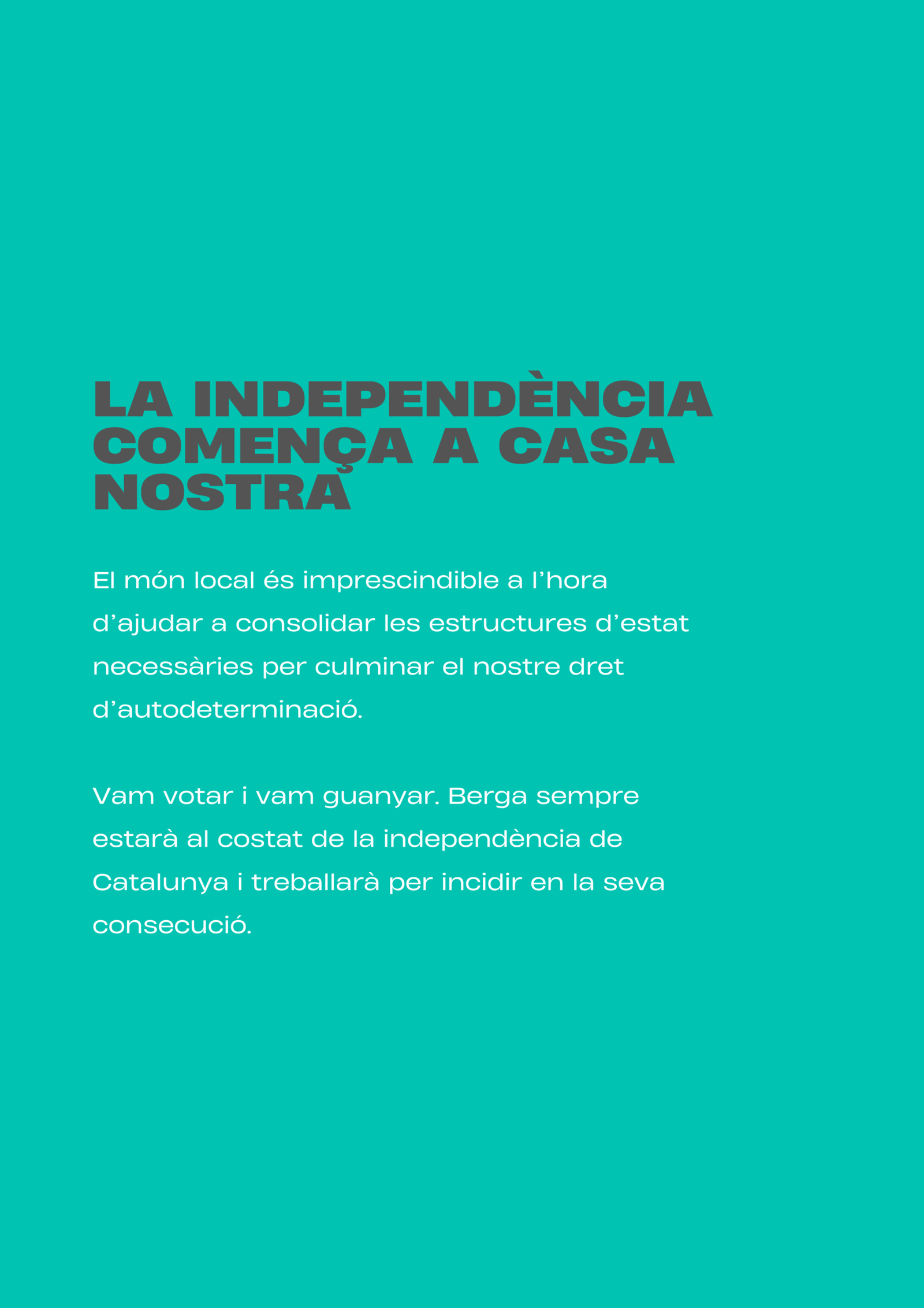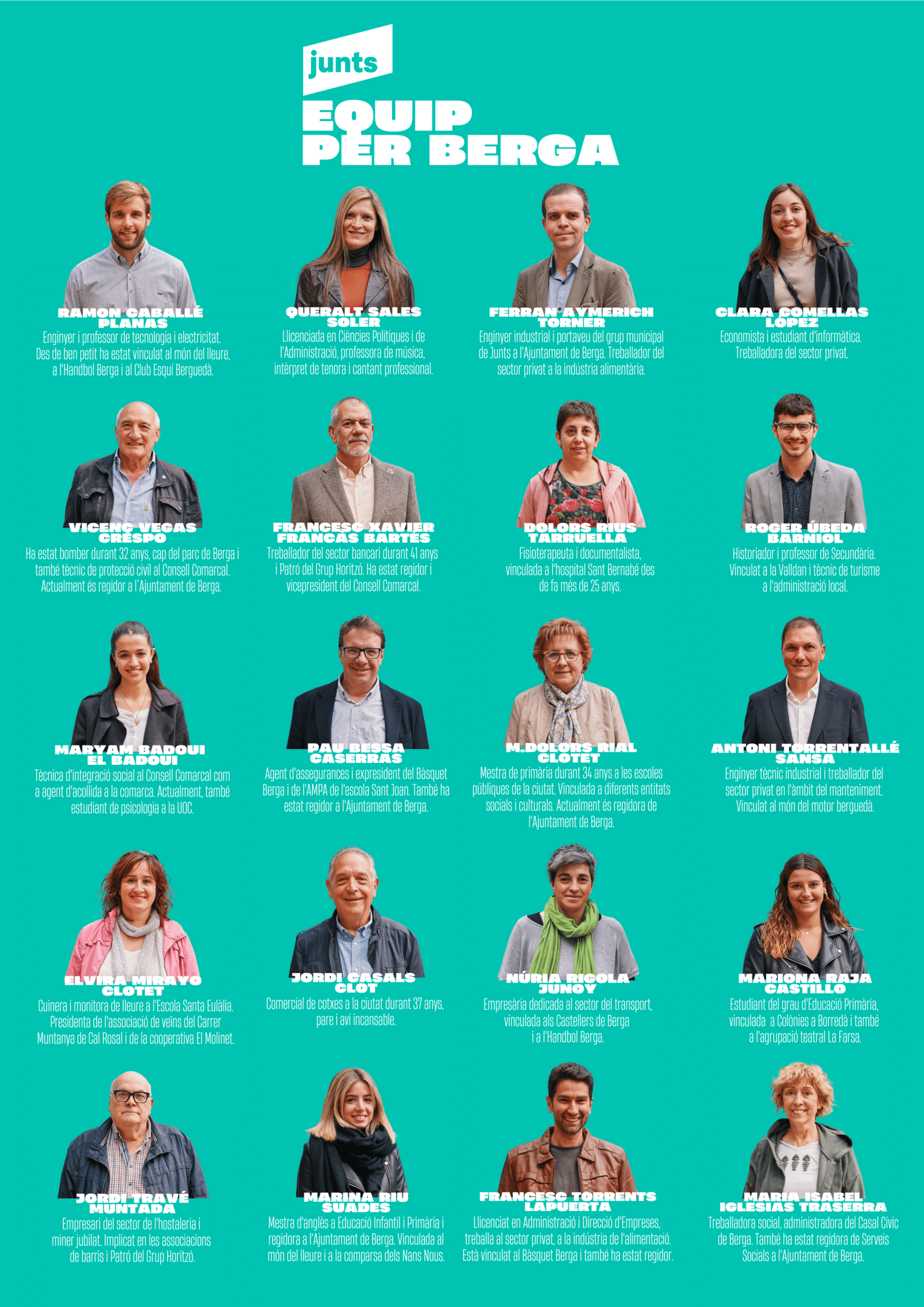 “Tenim un projecte clar: transformar Berga amb responsabilitat, innovació i cohesió social, perquè la ciutat sigui un lloc amb futur per a tothom. Berga necessita un canvi de rumb per tornar a liderar.”