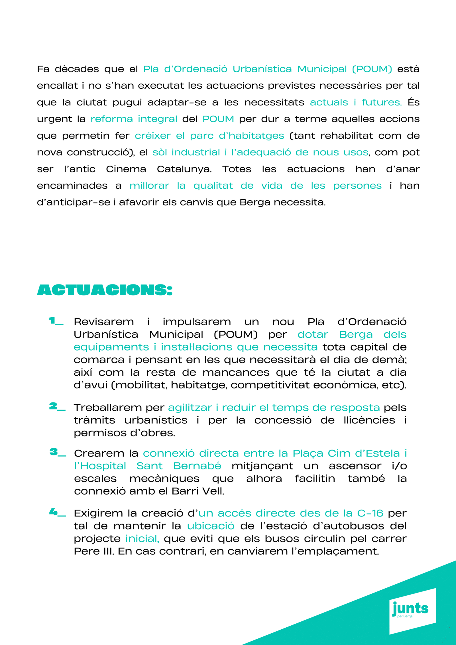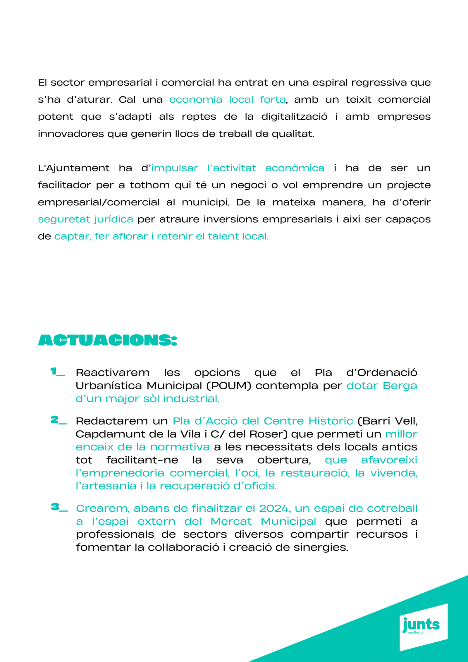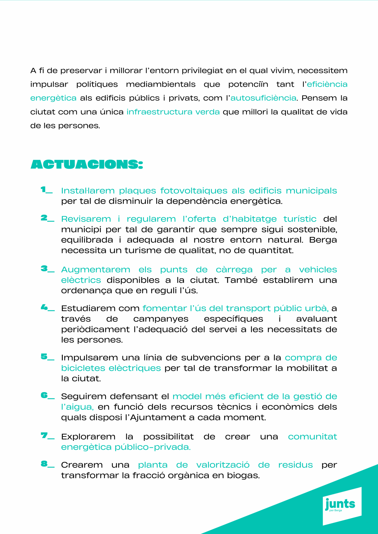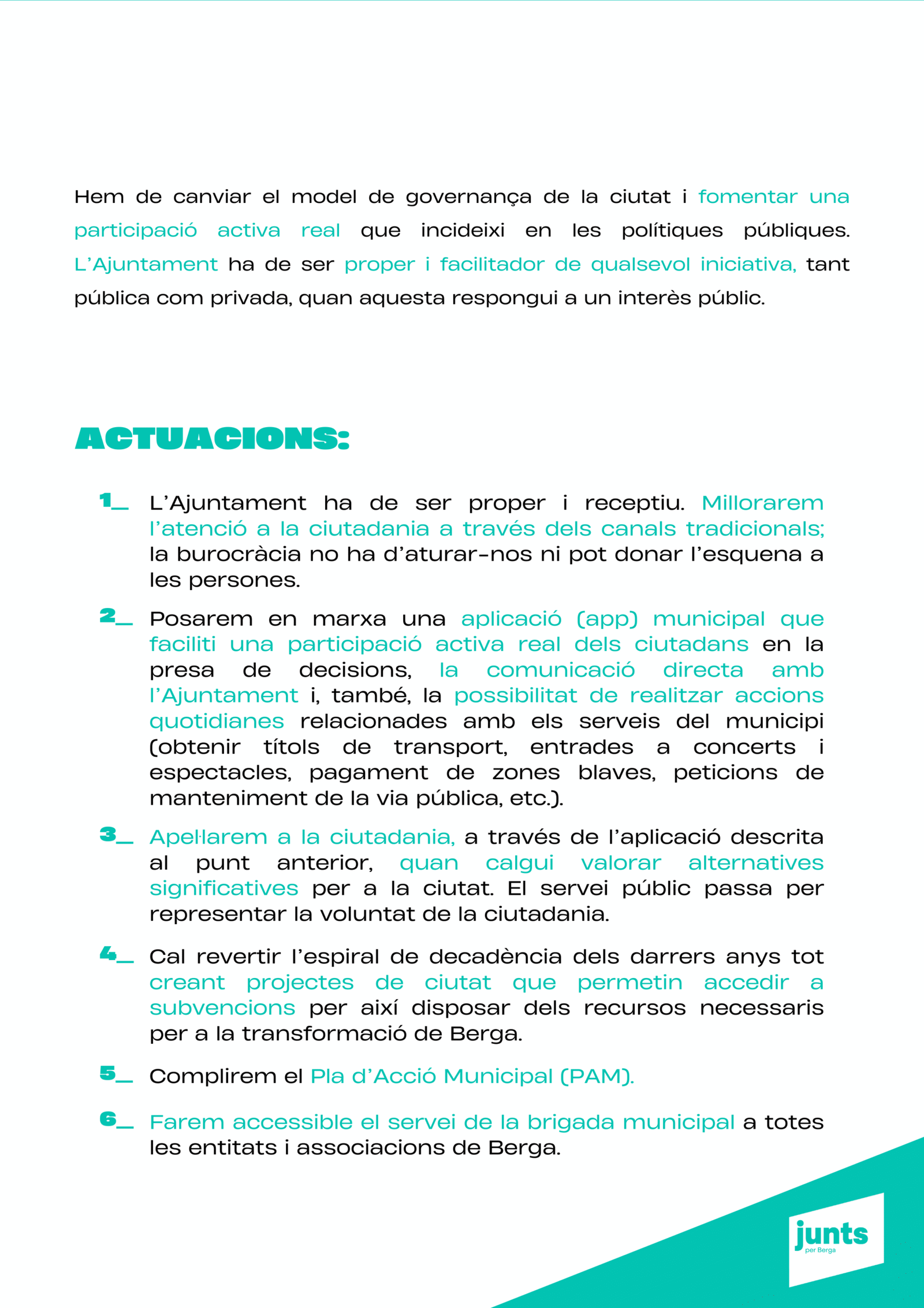 “Tenim un projecte clar: transformar Berga amb responsabilitat, innovació i cohesió social, perquè la ciutat sigui un lloc amb futur per a tothom. Berga necessita un canvi de rumb per tornar a liderar.”