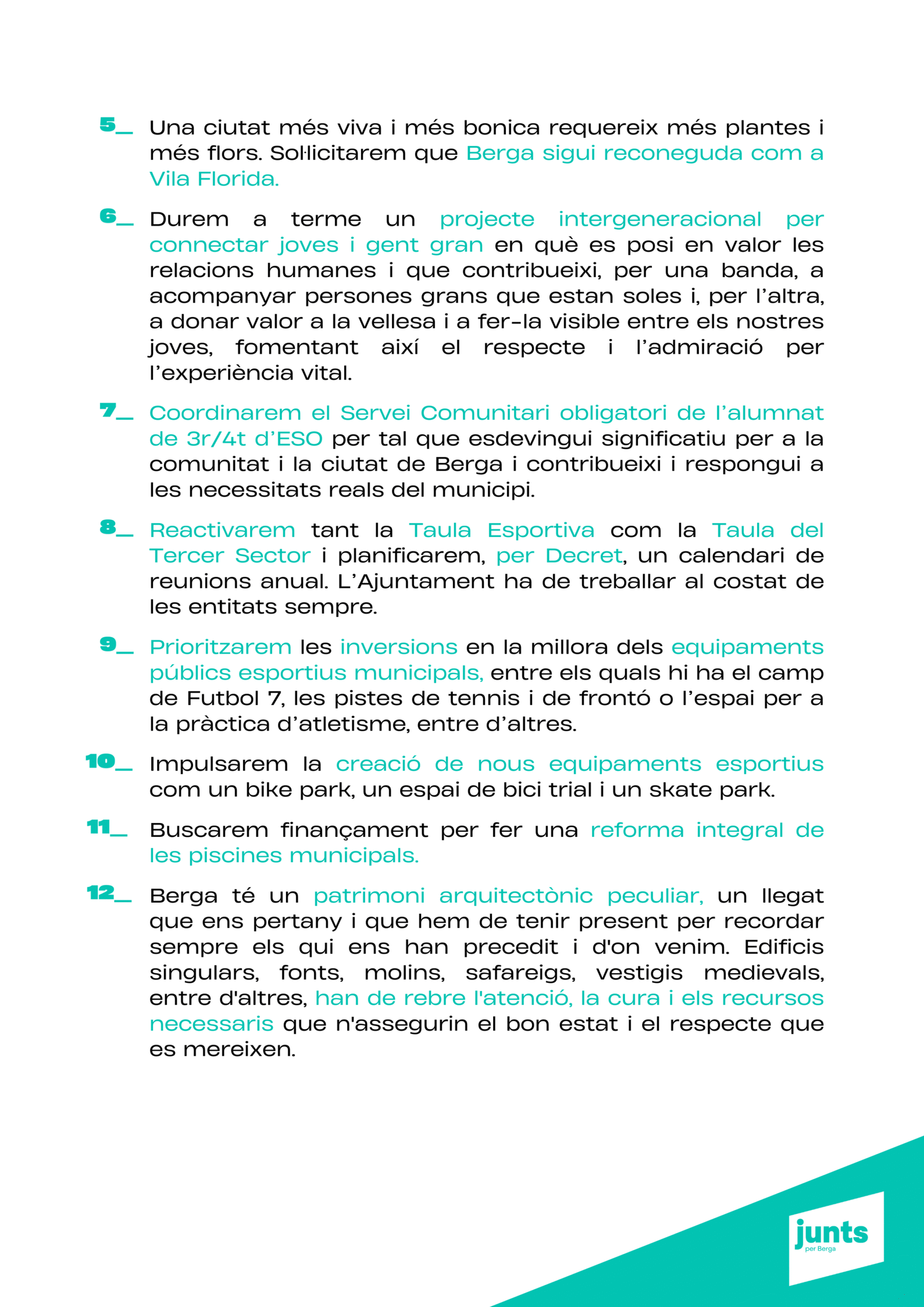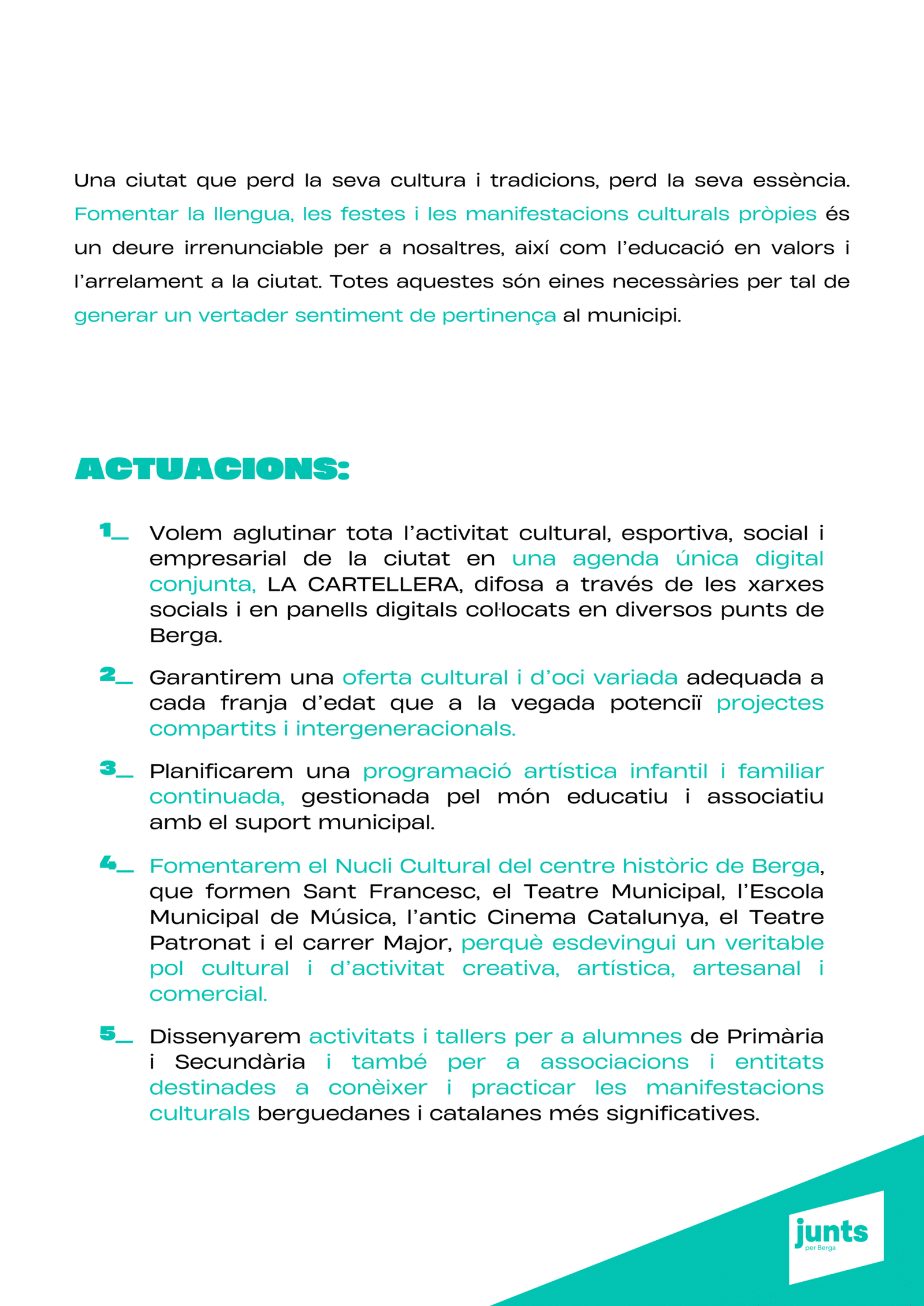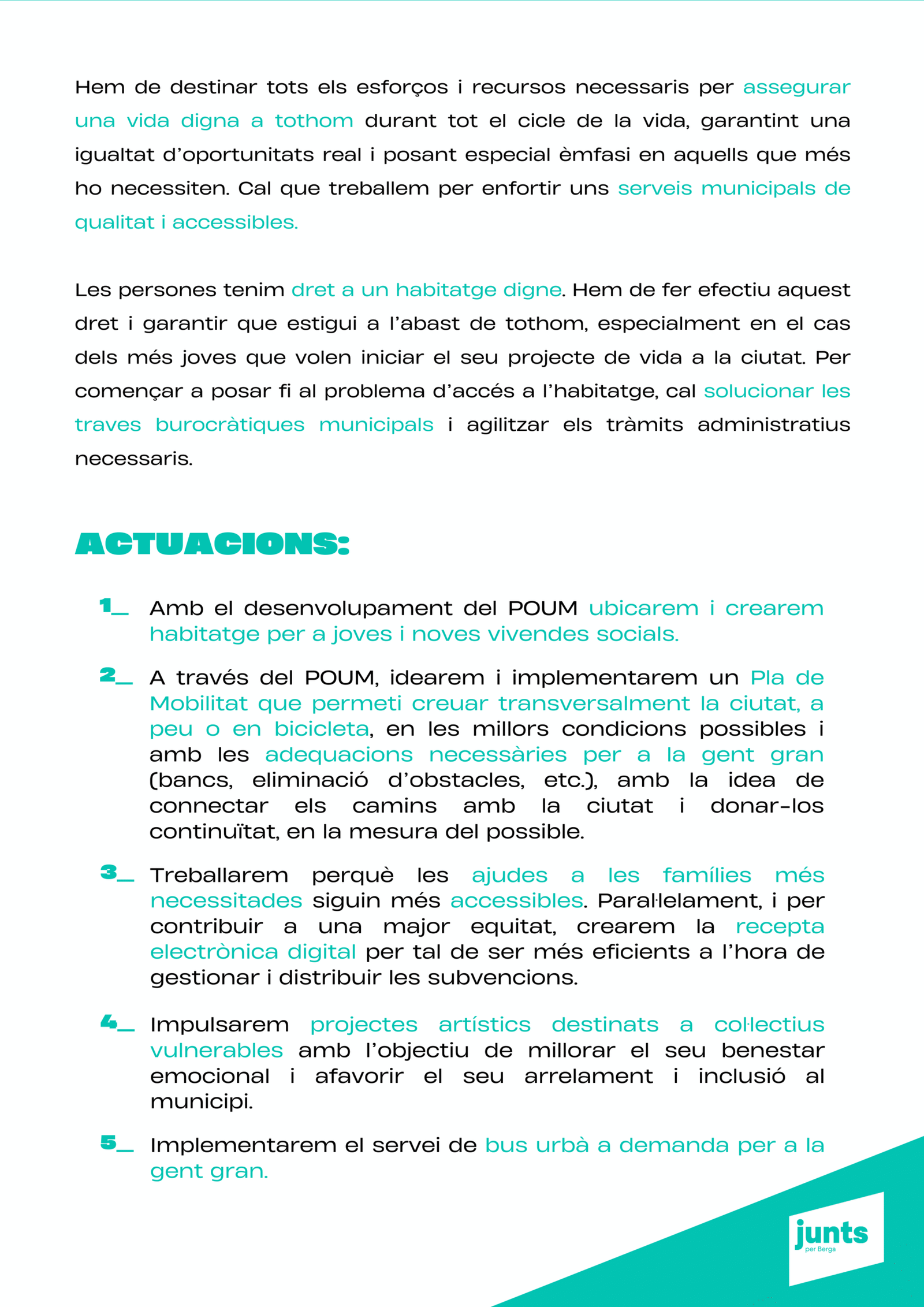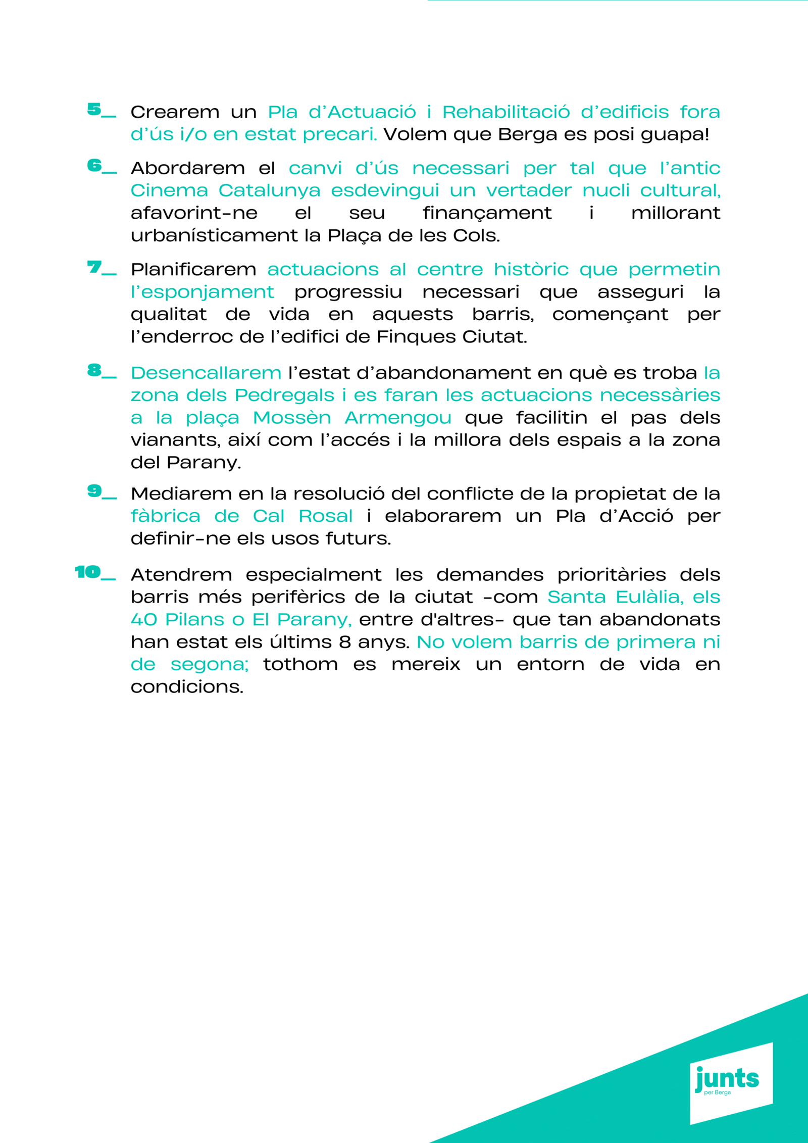 “Tenim un projecte clar: transformar Berga amb responsabilitat, innovació i cohesió social, perquè la ciutat sigui un lloc amb futur per a tothom. Berga necessita un canvi de rumb per tornar a liderar.”