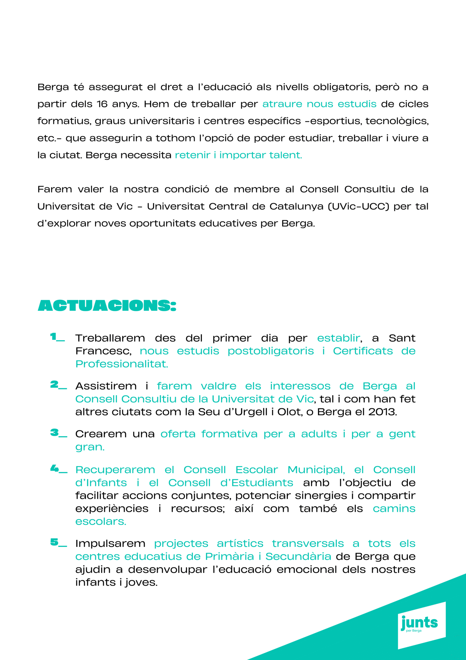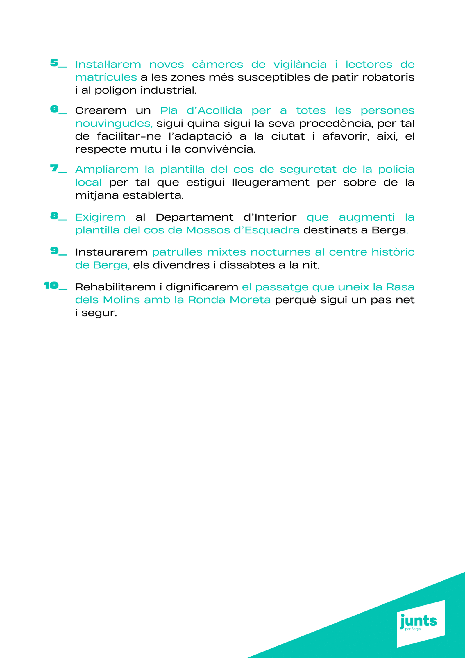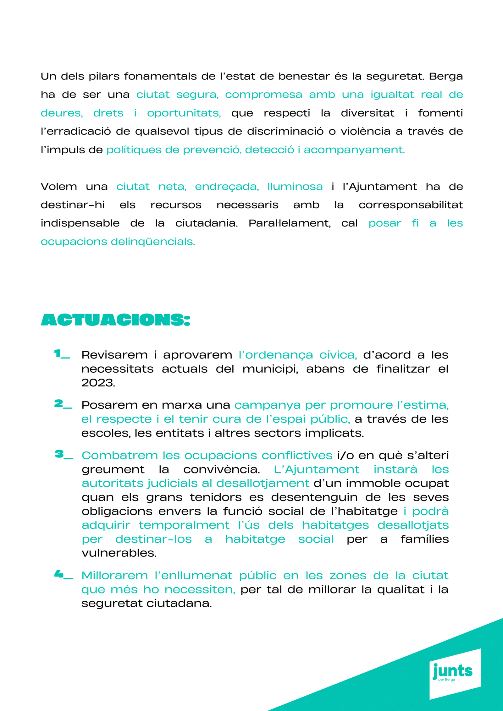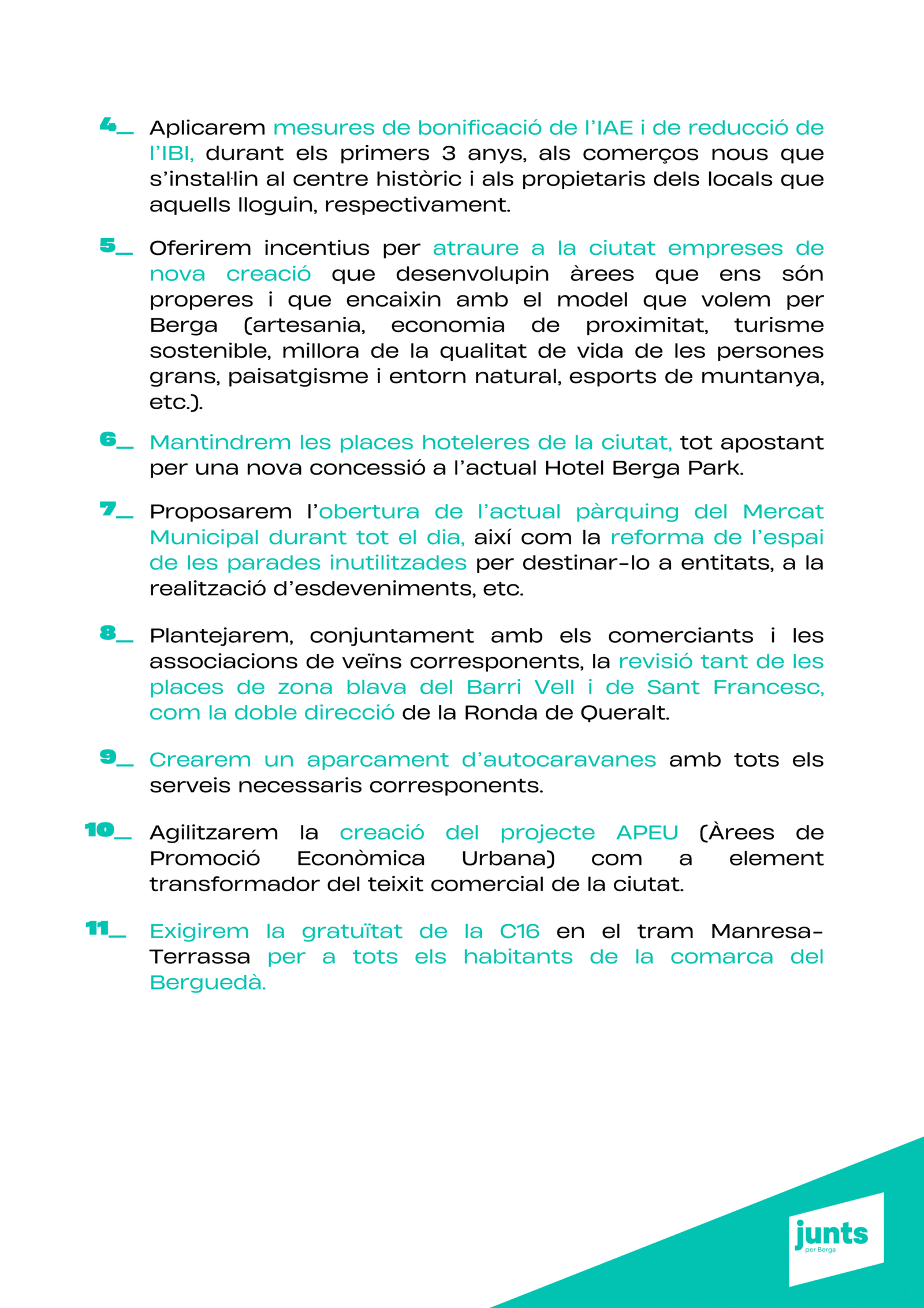 “Tenim un projecte clar: transformar Berga amb responsabilitat, innovació i cohesió social, perquè la ciutat sigui un lloc amb futur per a tothom. Berga necessita un canvi de rumb per tornar a liderar.”
